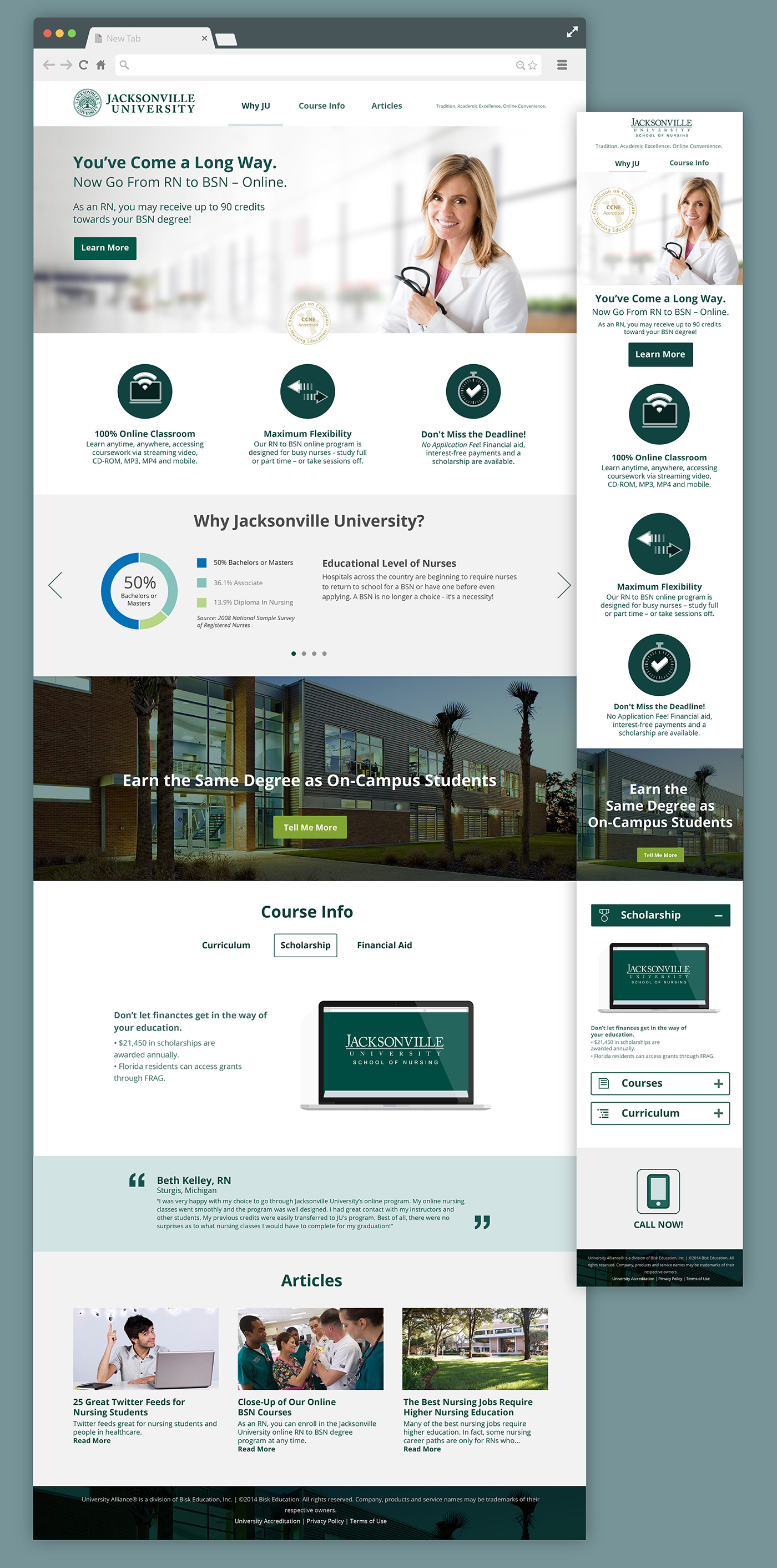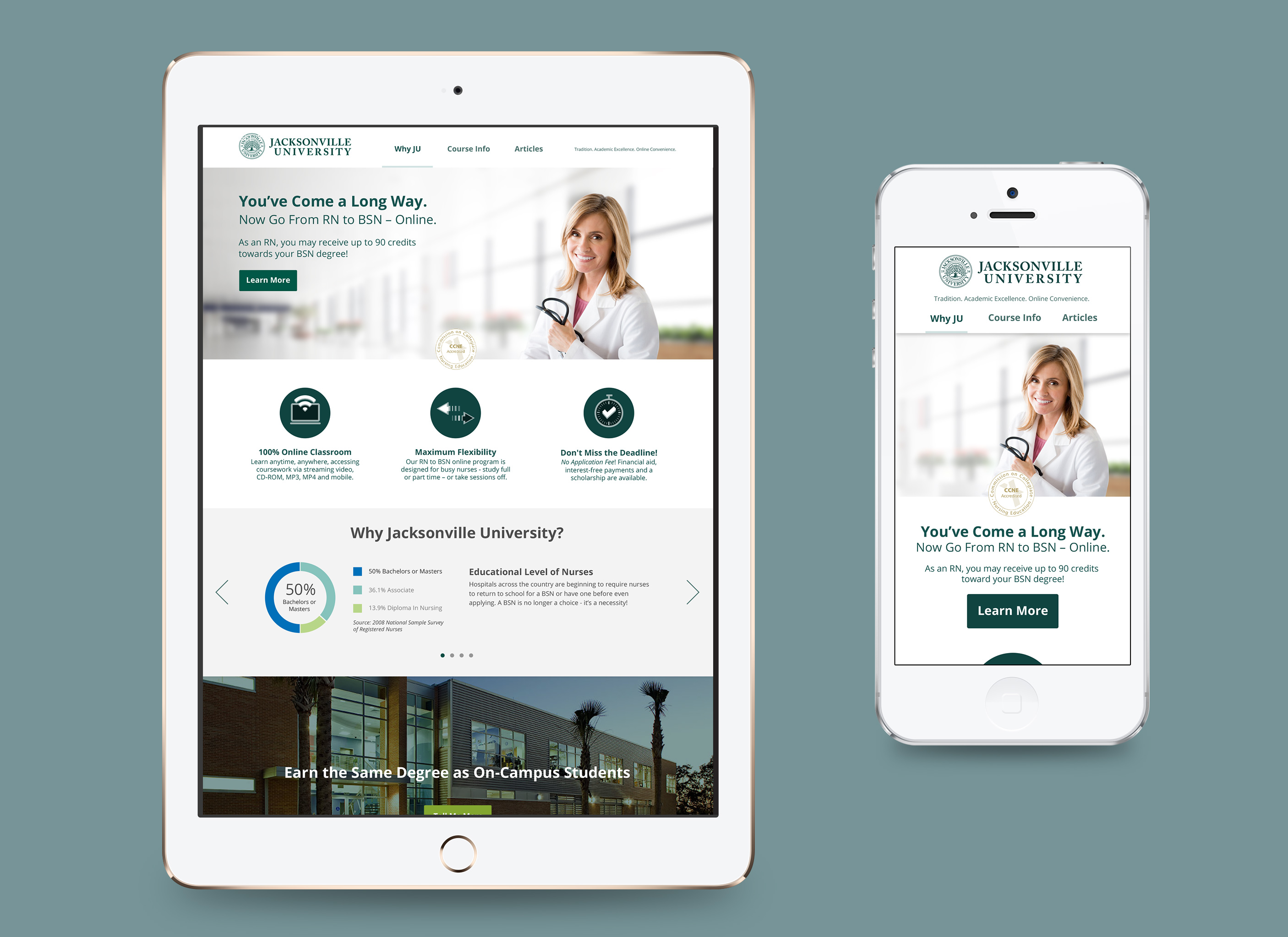 Jacksonville University's RN to BSN online degrees were losing in conversion and it didn't get enough quality leads. I don't blame them - people do not feel comfortable bying a $30,000-something degree online off of the scarce information on a landing page... In a normal world we would drive traffic and convert right on the website - however it wasn't up to industry's standards and immediate results were needed (as always).